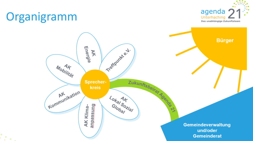 Mit dem Unterhachinger Treffpunkt Agenda21-Forum e.V. haben wir seit 2008 einen Trägerverein für einen Treffpunkt im Ortszentrum, der Mittelpunkt und Ausgangspunkt für bürgerschaftliches Miteinander sein soll, also einem Miteinander, welches sich den Prinzipien des Gemeinwohls unter Beachtung der Agenda 21 verpflichtet weiß. Mit diesem Treffpunkt soll die Vernetzung hinein in die Bürgerschaft, ihre Vereine und ihre Organisationen gefördert werden. Der Treffpunkt ist somit der gesellschaftliche Arm einer Lokalen Agenda, die sich auf der anderen Seite mit den Entscheidungen der Kommune zu befassen hat.